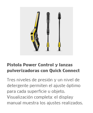 K4 Power Control, la nueva Hidrolavadora que te ayudará a obtener resultados de limpieza perfectos, gracias a la App Home & Garden de Kärcher, la cual incluye útiles consejos de trabajo dependiendo de la superficie u objeto que necesitemos limpiar. Incluye la manguera de alta presión de 8m, pistola G 160 Q Power Control, lanza turbo y lanza vario power. Motor a inducción refrigerado por agua. Certificado N°:DC-E-K50-030.1 Certificadora: IRAM